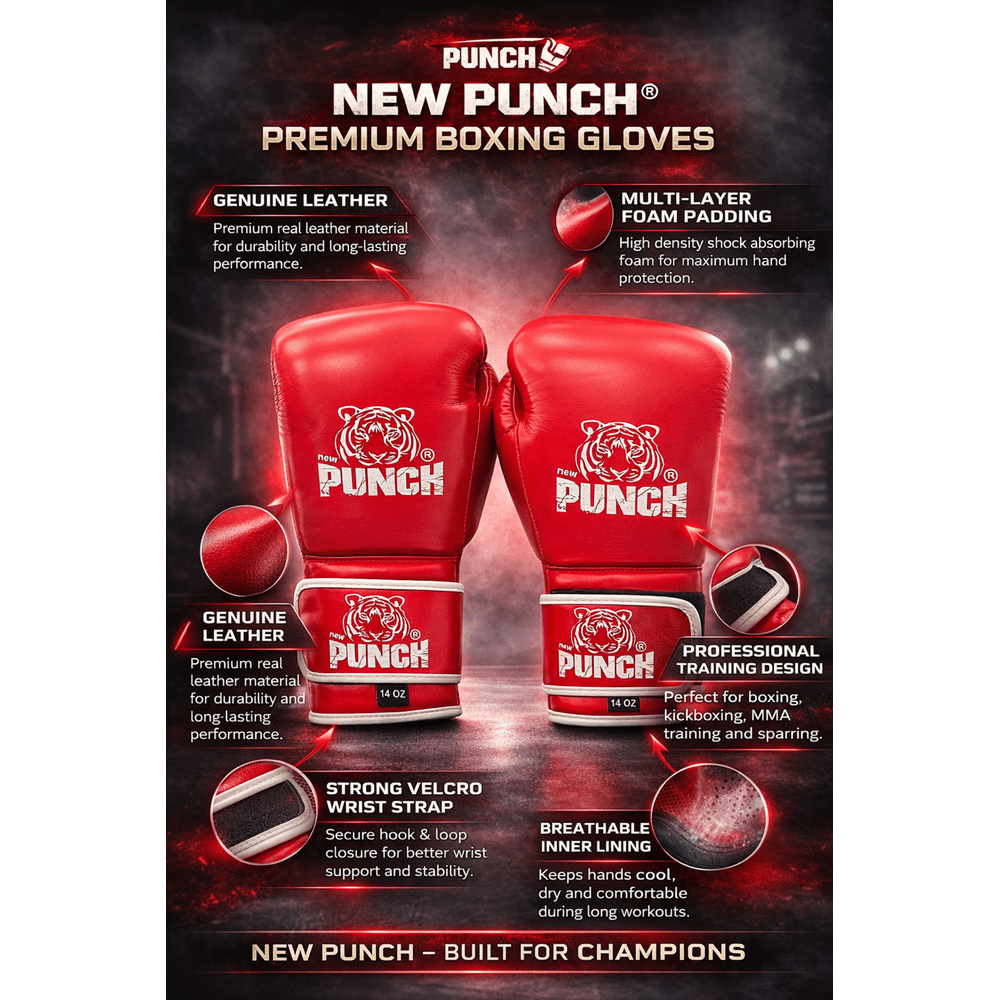 Train like a professional with the New Punch Premium Boxing Gloves, designed for durability, comfort, and maximum protection. Made from high-quality genuine leather, these gloves provide excellent performance for boxing training, sparring, and heavy bag workouts.